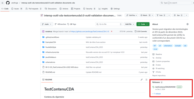 Afin d’améliorer la lisibilité et la stabilité des contrôles de conformité des documents CDA, l’Agence du Numérique en Santé (ANS) met en place un versionning des schématrons CDA publiés dans l’outil testContenuCDA, disponible sous un dépôt GitHub :